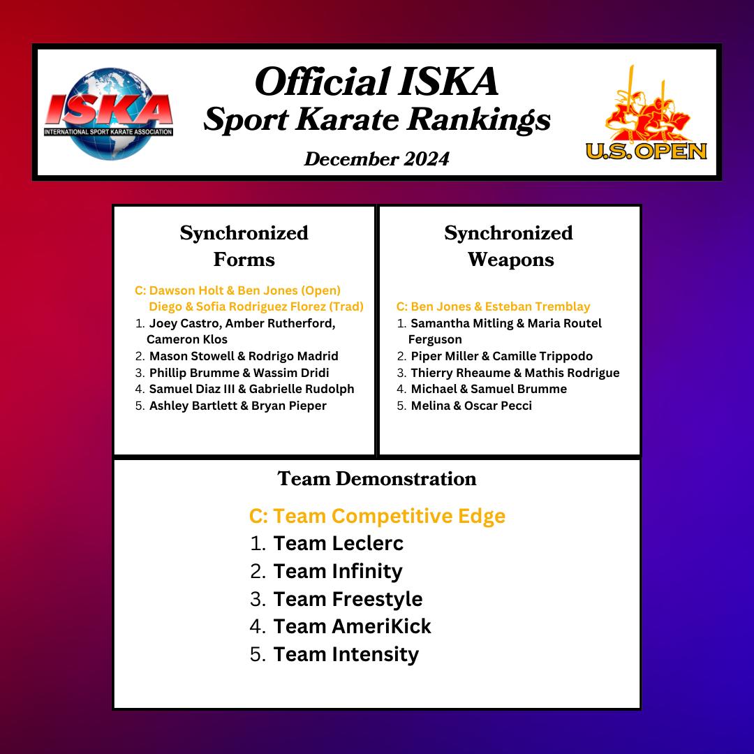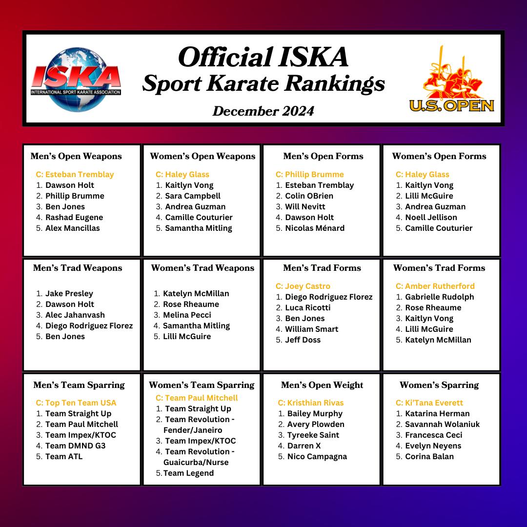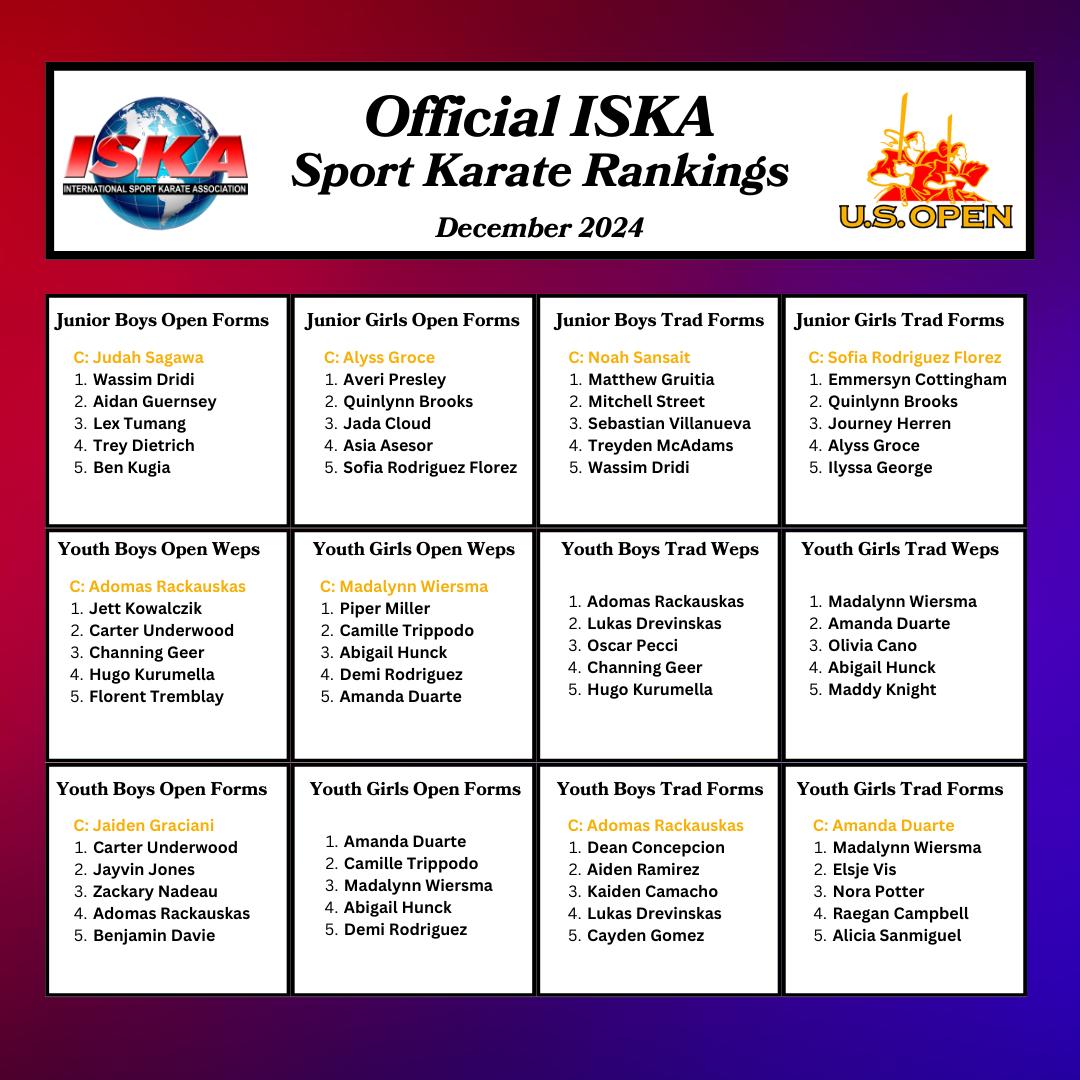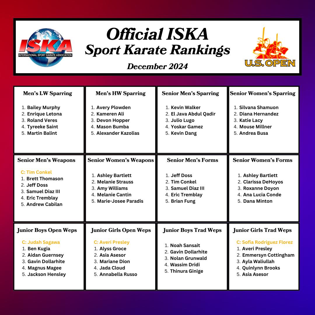 DECEMBER 2024 OFFICIAL ISKA SPORT KARATE RANKINGS Congratulations to the Word’s Very Best Sport Karate Competitors! 2025 Will be your best year ever!